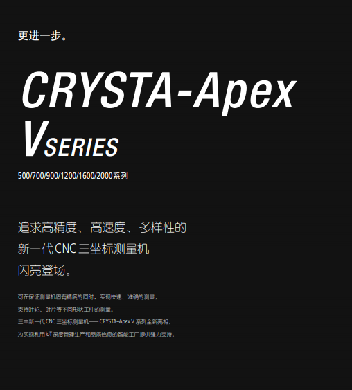 CRYSTA-Apex V系列是追求高精度、高速度、多样性的新一代CNC三坐标测量机,为实现利用IoT深度生产管理和品质管理信息的智能工厂提供强力支持。